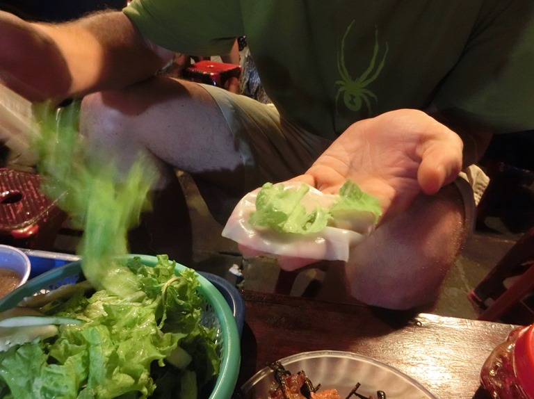 Este no creo que sea un plato famoso – por lo menos nunca he oído hablar de él, pero fue uno de los que más me gustaron y lo encontré vagabundeando entre los puestos del viejo barrio (old quarter) de Hanoi. Con una especie de filetes rusos de cerdo, fritos y especiados con eneldo y una pasta cocida que me volvió loco y con unos pocos tallarines fritos para dar un punto crujiente. Muchas verduras (en el fondo del plato, aquí no se aprecia bien), cacahuetes tostados, cebolla frita y lima calamansi, mi favorita – sabe a mandarina ácida.